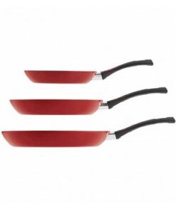Juego de tres sartenes Veryday. Esmalte porcelanizado en color rojo. Aluminio con antiadherente. Interior de teflón classic. Mangos fabricados en baquelita antitérmica que hace que no se calienten.Tiempo de entrega: Listo para envío